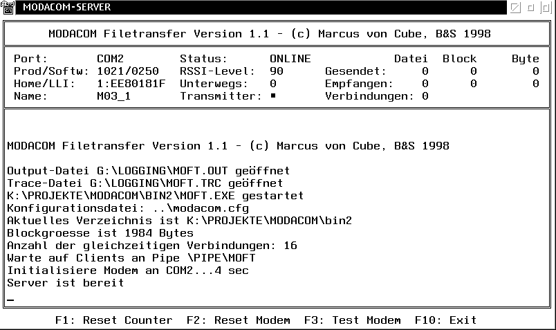 [C:\]MOFT PING Kunze MODACOM Filetransfer Version 1.1 - (c) Marcus von Cube 1998 Sende Testnachricht an Kunze: 1:EE123456 OK von Mobil-1 nach 3 Sekunden